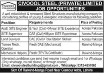 Candidates, if you are seeking CIVOOOL Steel Private Limited Jobs 2025 in Lahore, Apply Online yes. Then it would help if you tried to complete this CIVOOOL Steel Private Limited Jobs because here you can easily apply for these vacancies: Assistant. SITE Engineer, SITE Supervisor, Land Surveyer Trainee, Mech Operator, Mechanical Helpers.