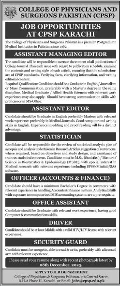 Candidates, if you are seeking College of Physicians and Surgeons Pakistan Kobs 2025, Apply Online yes. Then it would help if you tried to complete the College of Physicians and Surgeons Pakistan Jobs because here you can easily apply for these vacancies: Assistant Manager Editor, Assistant Editor, Statistician, Officer Accounts and Finance, Office Assistant, Driver, and Security Guard.