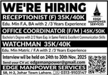 Candidates, if you are seeking Edge Manpower Services Jobs 2025 Online Application yes. Then it would help if you tried to complete the Edge Manpower Services Jobs because here you can easily apply for these vacancies: Receptionist, Office Coordinator, and Watchman.