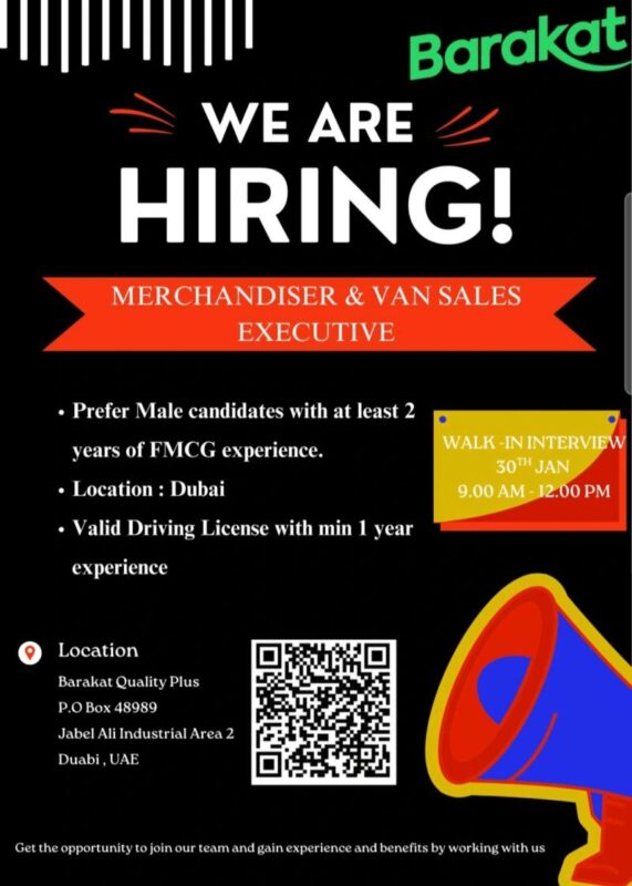 Interested candidates can attend the walk-in interview directly at the Barakat Quality Plus office in Jebel Ali Industrial Area 2, Dubai.