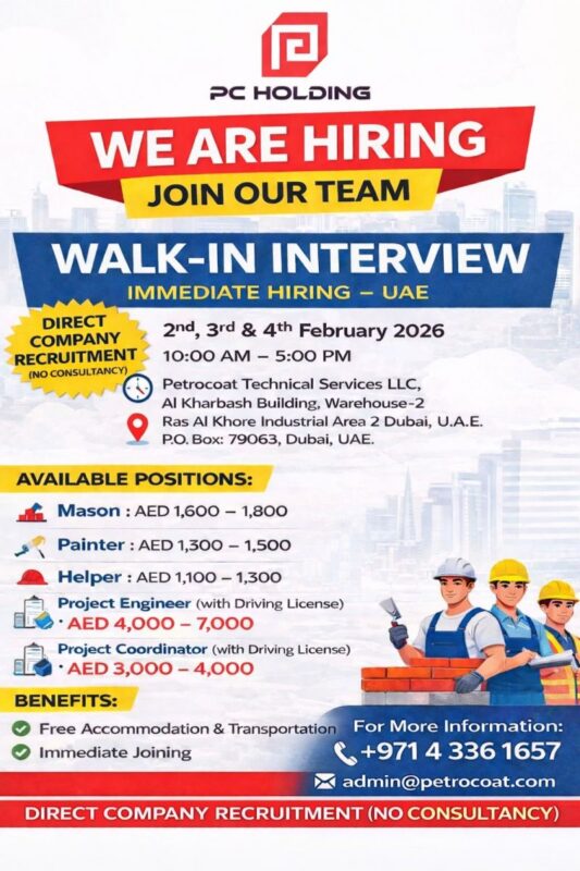 The walk-in interview in Dubai provides an excellent opportunity for candidates who reside in Dubai and Sharjah and the nearby Emirates to apply for construction and engineering and technical positions that offer competitive salaries and immediate employment.