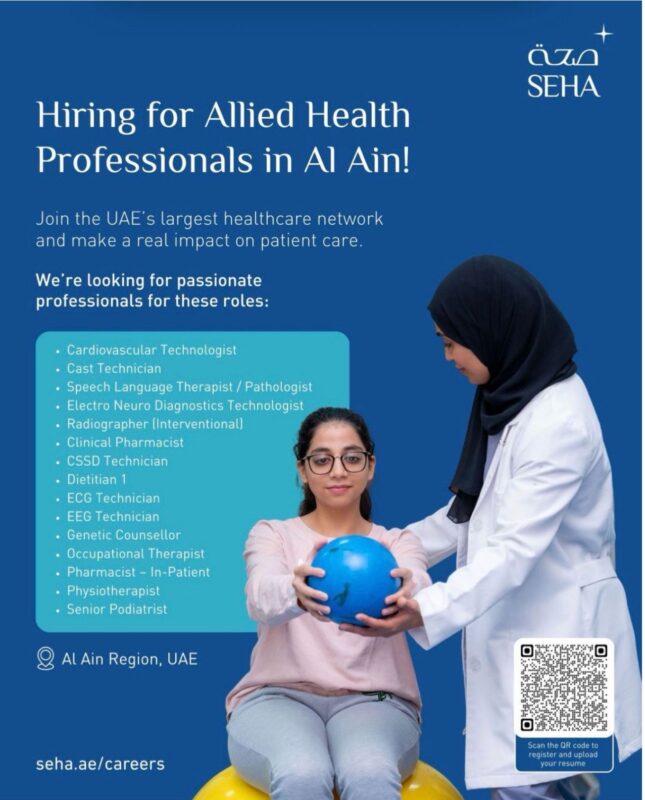 SEHA, the United Arab Emirates’ biggest and most comprehensive health care system, is seeking Allied Health Professionals in Al Ain (UAE) through SEHA Recruitment. The recruitment campaign demonstrates SEHA’s continuing commitment to providing superior patient care across the UAE, particularly in Al Ain. Candidates will be able to access jobs in Al Ain in 2026 and at other SEHA locations, as well as many other careers opportunities through the SEHA network.