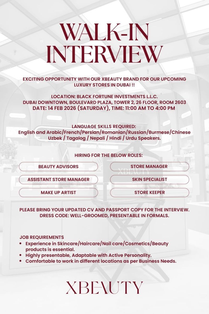 The XBeauty Walk in Interview requires interested candidates who want to work in beauty jobs in Dubai to come to the interview at the scheduled date and time. The program provides optimal resources for individuals who want to begin or progress their professional journey in luxury retail and beauty service positions within Dubai.