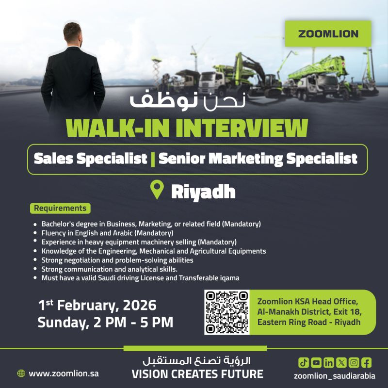 The recruitment drive will benefit you if you are looking for sales positions in Riyadh 2026 or marketing specialist positions in Saudi Arabia or heavy machinery sales jobs.