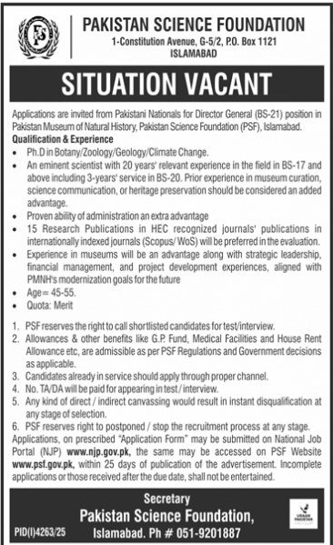 - An eminent scientist with 20 years’ relevant experience in the field in BS-17 and above, including 3 years’ service in BS-20. Prior experience in museum curation, science communication, or heritage preservation should be considered an added advantage.